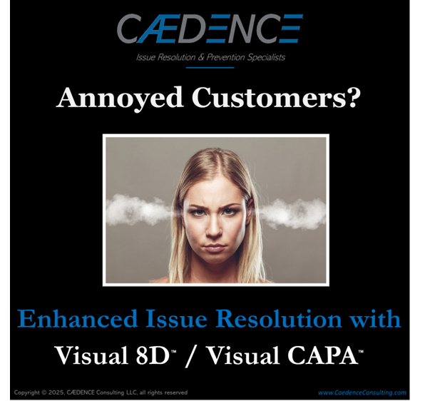 THE SOLUTION: CAEDENCE's Visual 8D™ / Visual CAPA™ enhanced problem-solving toolkit was the answer. It integrated seamlessly with our existing problem-solving approach and systems. The customer loved it! Without any extra effort, my team was instantly creating work products the customer could understand and an update storyline they could have confidence in.