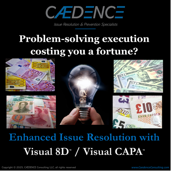 Visual 8D™/Visual CAPA™ is the answer. Readily customizable to your company's preferred paradigm and terminology, our straightforward Powerpoint-based templates guide teams through ANY problem-solving process while seamlessly producing easy-to-follow visual outputs that customers love. Leveraging the similarity of the most popular issue-resolution approaches, V8D™/V-CAPA™ integrates seamlessly into your systems without disruption. There's no need to scrap or re-invent your chosen approach and there's no need to retrain your staff.