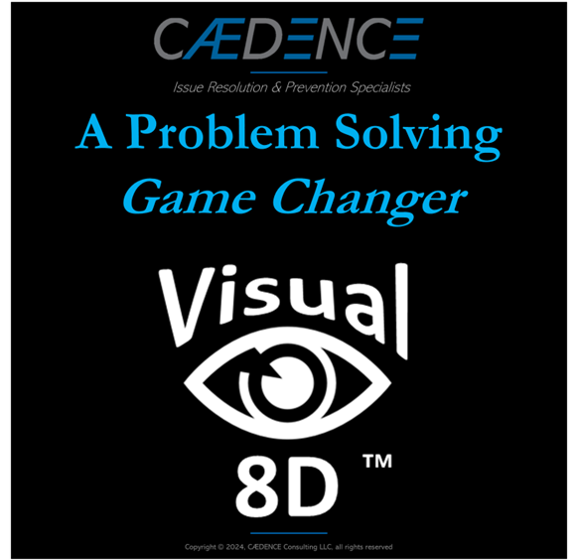 CAEDENCE has developed a novel improvement to overcome the communication-based shortfalls in existing methods. Applicable to all structured problem-solving approaches, Visual 8D™ enables teams to execute the familiar problem-solving steps (with no additional effort), while capturing plans and progress in easy-to-follow diagrams. Visual 8D™ puts teams in the position of providing answers to management and customer questions before being asked, resulting in improved control of the situation and minimizing time wasted on extraneous actions.